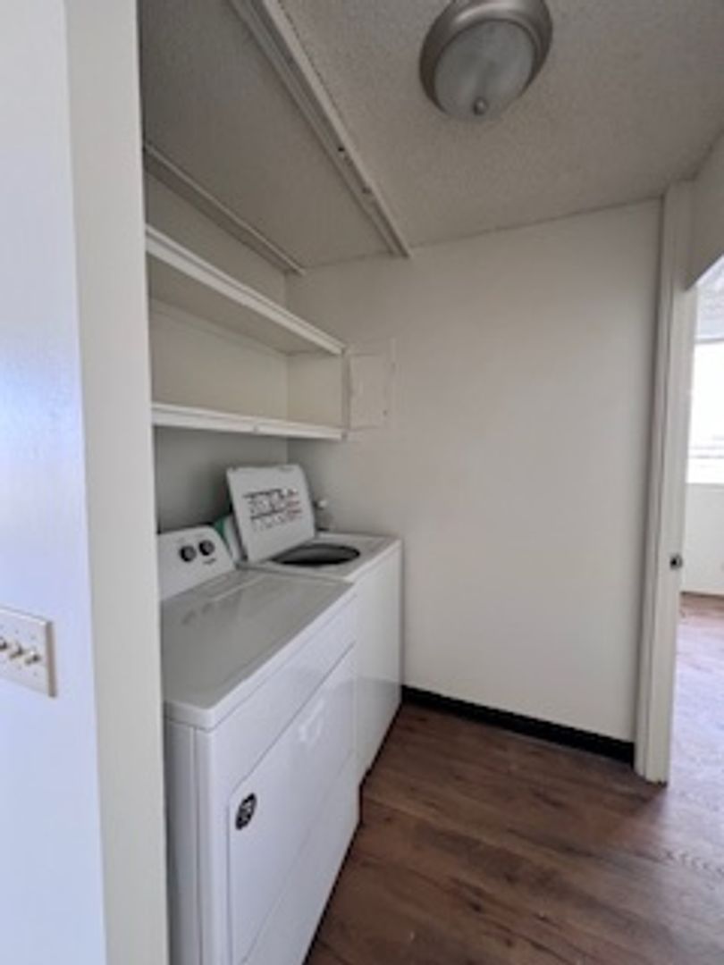 1 parking stall included, full size washer and dryer, pool, guest parking, and resident manager on site.