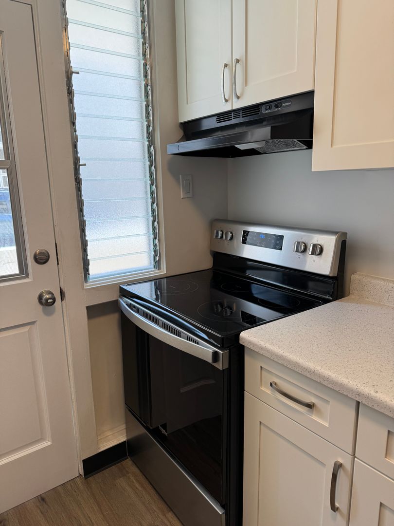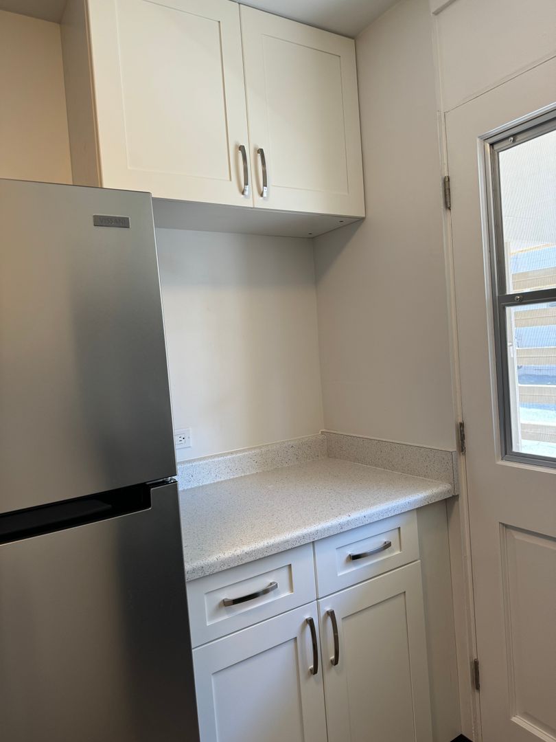 The kitchen is equipped with a full-sized refrigerator, a 4 burner range oven, with lots of cabinets.