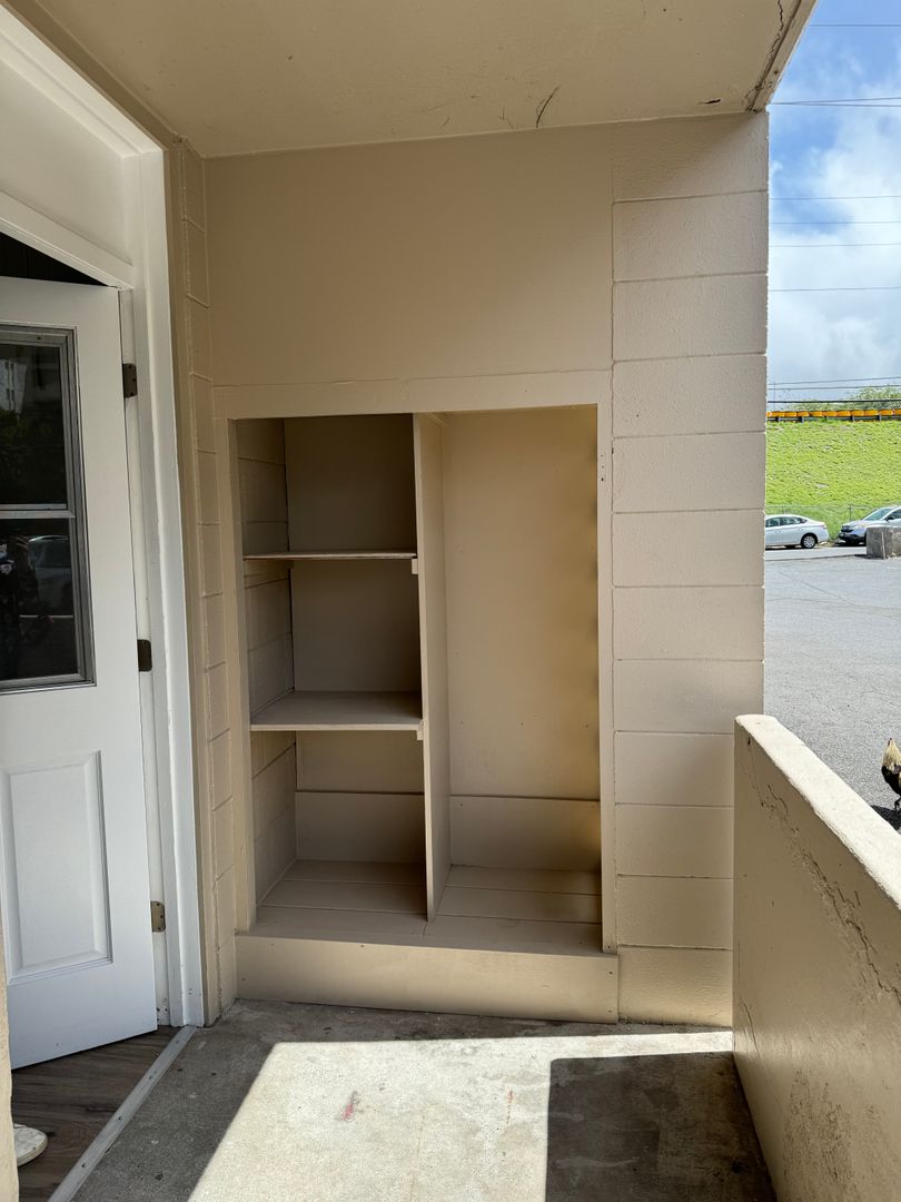 Washer/dryer hookups, outdoor sink, and storage shelves on back lanai.